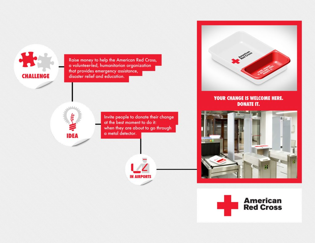 American Red Cross, een humanitaire organisatie geleid door vrijwilligers, vraagt op het juiste moment om een kleine donatie. Het juiste moment? When you are about to walk through the metaaldetector, omdat je dan toch je zakken leeg moet maken. Een simpel doch goed uitgewerkt idee.