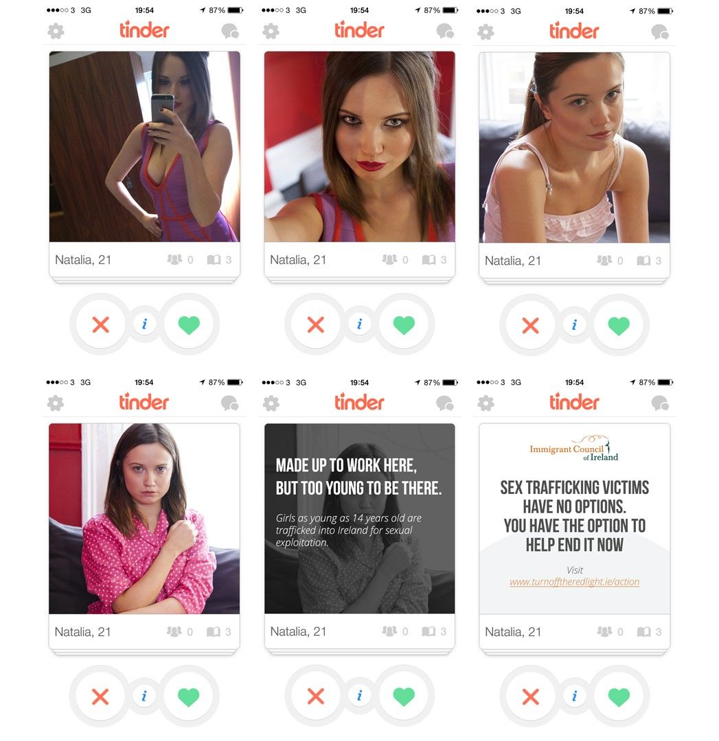 The ‘Immigration Council of Ireland’ just launched a new campaign on Tinder on behalf of the Immigration Council of Ireland to create awareness about sex trafficking in Ireland. The campaign used Tinder to raise awareness about the crimes behind sex trafficking and prostitution, using Tinder profiles to tell stories about victims of trafficking. The profiles feature pictures of girls, which with every swipe illustrate the impact.