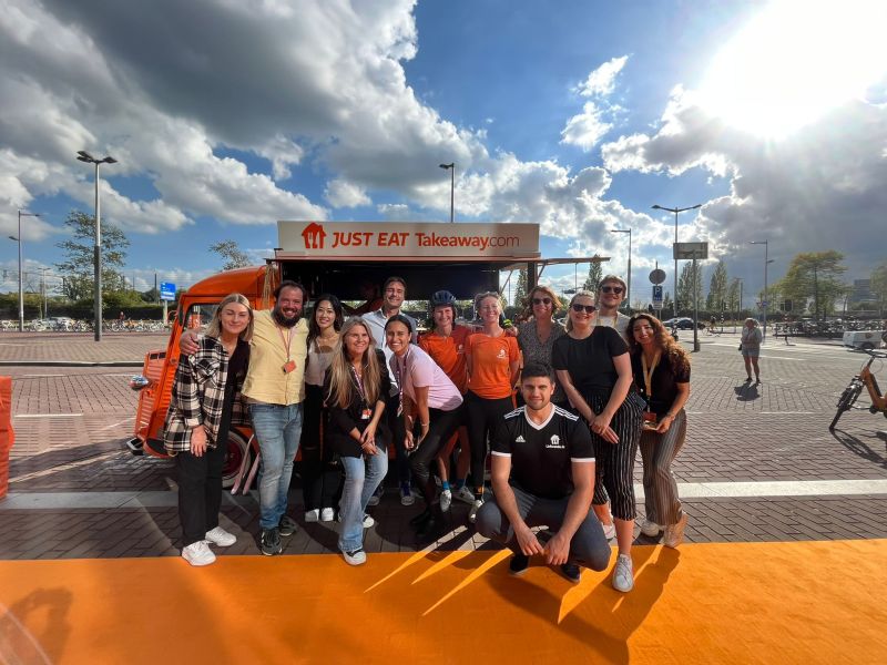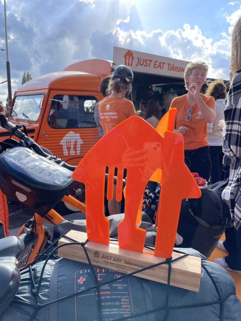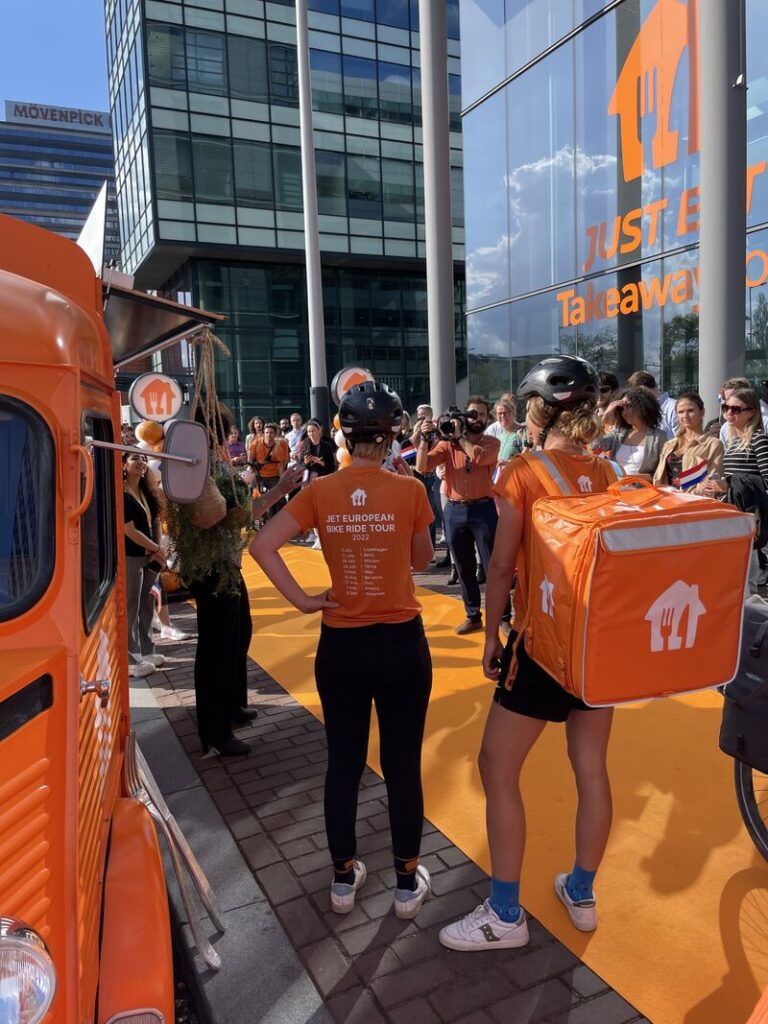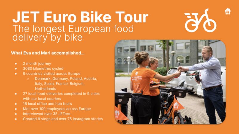 Bikers Mari and Eva just completed “The longest food delivery tour on a bike ever completed in Europe”. For Just Eat Just Eat Takeaway.com they did 3080km of cycling on a normal bike. Not even an e-bike. Yesterday afternoon they arrived in Amsterdam. Mari and Eva cycled before, but this one was quite different. First of all they stayed at the homes of JET colleagues getting the full team orange experience. Apparently, this is a normal thing among cyclists. The delivery took exactly 2 months to complete. They started in Copenhagen on July 6th, went through Berlin to Wroclav to Vienna, to Milan to Barcelona, Paris, Antwerp and back home to Amsterdam where they arrived yesterday on September 8. They cycled through 9 countries, made 27 food deliveries, had 16 office and hub tours, met over 100 JET’ers across Europe, resulting in more than 35 interviews leading to 9 video episodes and over 75 Instagram stories.